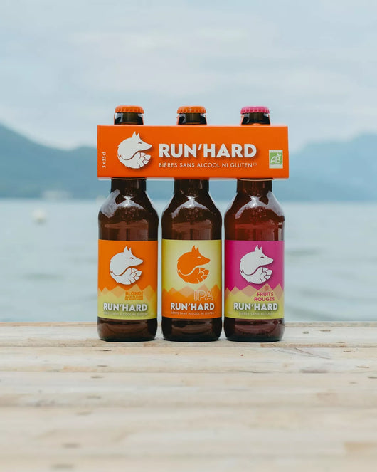 La bière BLONDE sans alcool ni gluten 33cl - RUN'HARD est une bière blonde de type Pale Ale, "healthy" au possible, légèrement ambrée, boostée aux plantes de montagne. Run'Hard ajoute également de la fleur de sel à sa recette, touche minérale & gustative complémentaire !