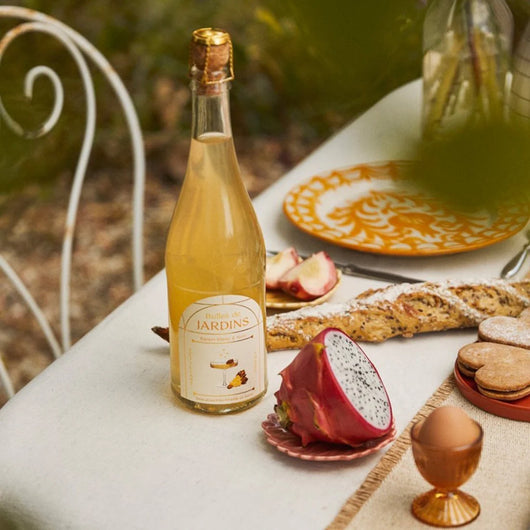 Bulles de Jardins, notre gamme de pétillants gastronomiques sans alcool, bio & faibles en sucre. Pensés pour accompagner vos repas, de l'entrée jusqu'au dessert.